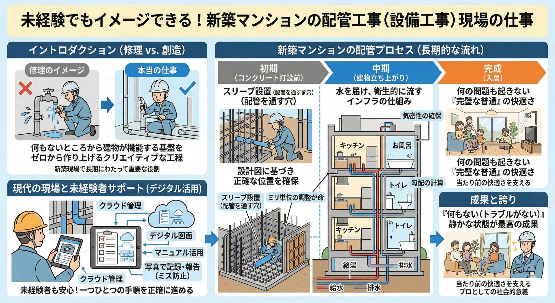 設備工事という仕事のやりがいは、他の職種とは少し異なる特徴を持っています。多くの仕事では「完成したものが目に見えて評価されること」が喜びとなりますが、給排水設備のプロにとって最大の喜びは、建物が完成した後に「何の問題も起きない(トラブルゼロ)」という静かな状態が続くことです。水漏れが起きない、詰まりが発生しない、嫌な音がしない。入居された方が私たちの仕事の存在すら意識せず、当たり前に毎日を過ごせていることこそが、プロとしての完璧な勝利を意味します 。